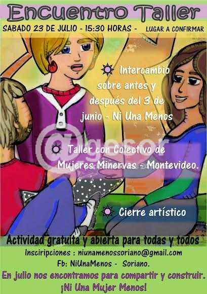 Con la organización de Ni Una Menos Soriano estará desarrollándose el sábado 23 a las 15.30 horas en salón de COVIANALPA 2 ubicado en Giménez y 8 de Octubre, a taller de intercambio sobre antes y después del 3 de junio "Ni una menos" con la presencia de representantes del colectivo de Mujeres Minervas de Montevideo y finalmente habrá cierre artístico.