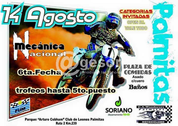 Este domingo se disputa en el municipio de Palmitas la 6ta. Fecha del campeonato Mecánica Nacional de motociclismo. La actividad se sedarrollará en el parque “Arturo Cobham” (Ruta 2, kilómetro 239) siendo organizada por el Club Wanderers de esta localidad. Además de la 6ta. Fecha del campeonato Mecánica Nacional se competirá en dos categorías invitadas: Open FI, y Vale todo.
