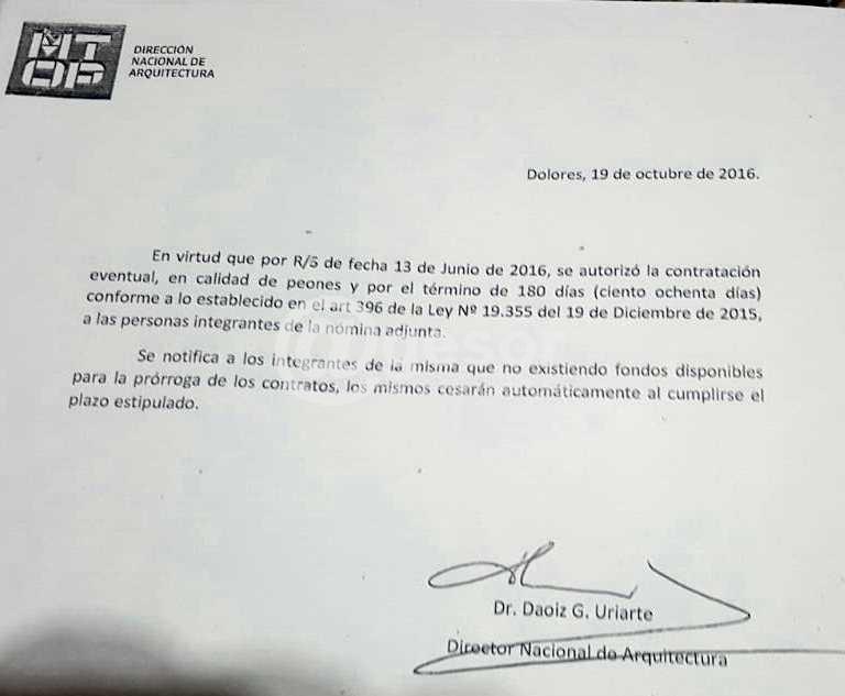 El Diputado Enzo Malán ante la publicación realizada por @gesor mantuvo contacto con el Dr. Daoiz Uriarte, Director de Arquitectura del MTOP ante el anuncio del propio Uriarte (firmado por él) como lo mostró nuestra Agencia de Noticias de cesar los contratos a los 180 días sin utilizar la prórroga que por única vez se les había establecido en el acuerdo, argumentando: "no existiendo fondos disponibles para la prórroga de los contratos".