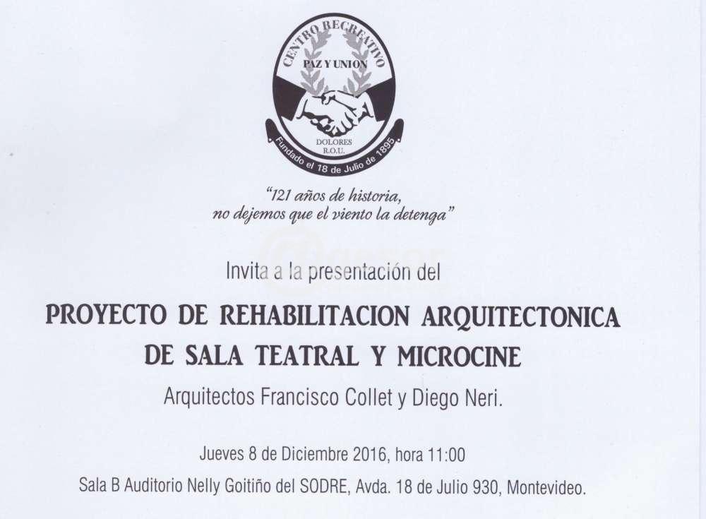 Por tal motivo invitan a la presentación del proyecto de Rehabilitación Arquitectónica de Sala Teatro y Microcine del Paz y Unión de Dolores, evento que ?contará con la presencia de ?personalidades, autoridades, artistas, ??empresarios? ??y ?será conducido por Adriana Da Silva y Leonardo Lorenzo?.