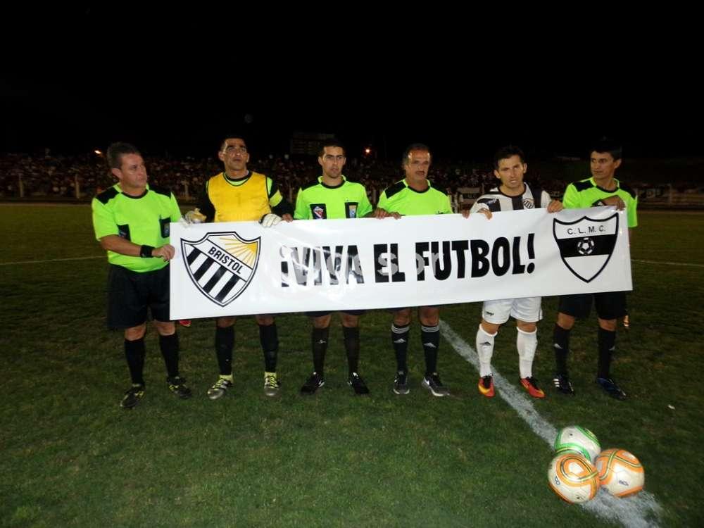Previo al inicio del juego, los capitanes de ambos equipos, Diego Pérez por Bristol y Federico Bennett por Con Los Mismos Colores, junto a la cuarteta arbitral, exhibieron una pancarta alusiva al fútbol, como fiesta y sin violencia.