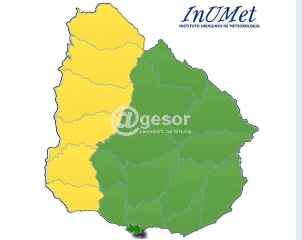 Desde INUMET se informó a @gesor sobre la advertencia meteorológica con riesgo de color amarillo para todo el Litoral Oeste, aunque dividido en dos partes, por un lado la zona 1 que abarca Soriano, Colonia y Río Negro y la zona 2 Paysandú, Salto y Artigas. Para el caso de la zona 1 la advertencia se encuentra en curso y volverá a actualizarse el pronóstico a las 18.00 horas, previéndose con 75% de probabilidades, la ocurrencia de lluvias abundantes y tormentas intensas.