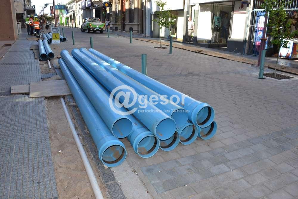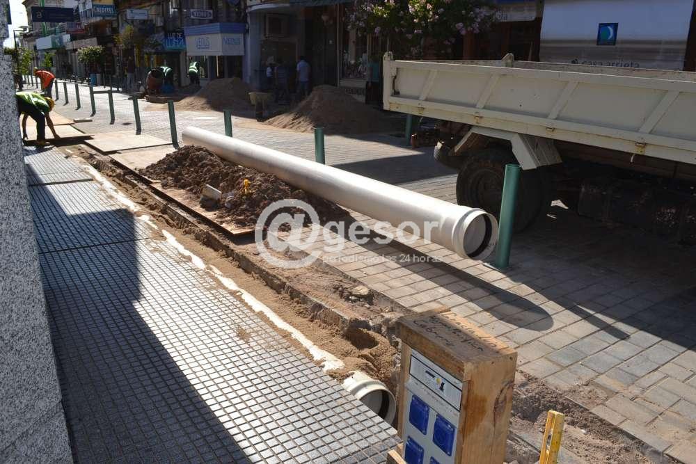 En forma paralela, también se están ejecutando obras de instalación de la red de drenajes en la semipeatonal, colocándose ductos de PVC, así como también preparando los registros de desagüe correspondientes.