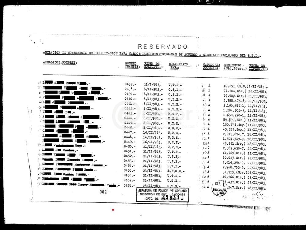 Documentos de la época revelan estos procedimientos que si bien no son una novedad corroboran lo que es parte del anecdotario popular. @gesor accedió a alguno de esos documentos militares que reflejan esa perversidad por espiarlo todo. Hechos que ocurrieron durante todo el período dictatorial. A modo de ejemplo el 4 de abril de 1983, el Coronel Nelson Rodríguez, Delegado departamental del SID (Servicio de Información de Defensa), informaba al general Germán de la Fuente sobre la “relación de Constancias de habilitación para cargos públicos, expedidos por esta agencia, durante el mes de febrero ppdo”. Detallando como lo reflejan las fotografías que acompañan esta nota, la nómina de mercedarios que habían iniciado trámites para ingresar a la UTE, OSE, Banco República. Optamos por proteger la identidad de estas personas pues este artículo pretende hacer foco en el espionaje sistemático a que eran sometidos los ciudadanos y no distraer la atención en otras cuestiones.
