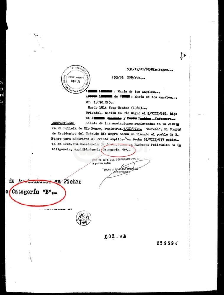 Otro documento fechado el 17 de noviembre de 1982, en Río Negro, el sub Comisario Lucas de Armas, coloca a una mujer en la Categoría “B”. Esta mujer, María de los Angeles A… fue colocada en esta categoría por haber firmado un aviso en el semanario Marcha (5/11/1971) como integrante del Comité de residentes de Río Negro con “un llamado al pueblo de R.Negro para adherirse al Frente Amplio”.