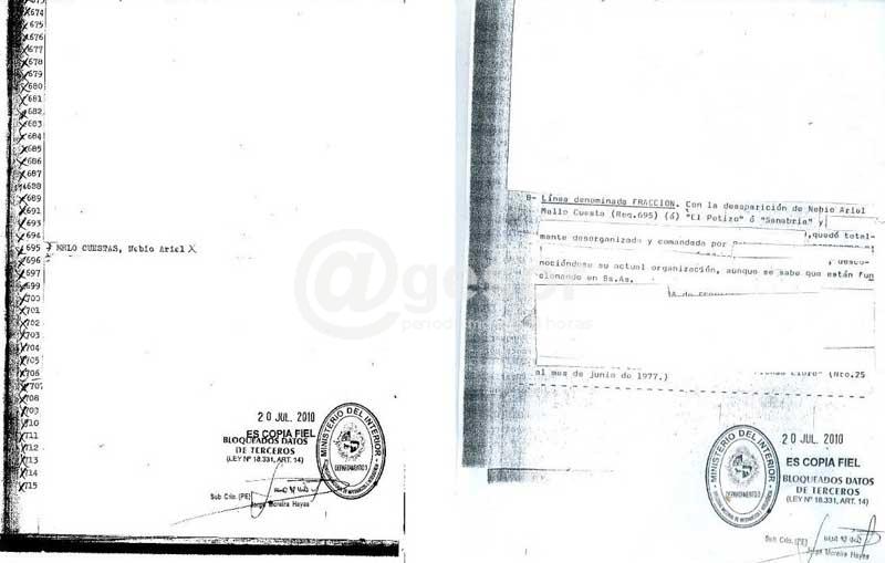 Uno de los documentos era un listado de personas (detenidas o requeridas, no se especifica) que se enumeran del 673 al 715 y en el que Melo aparece con el número 695. Todos los demás nombres fueron censurados por la ley de hábeas data. Otro tanto ocurre con otro documento de una página del que sólo desde la mitad de la hoja se deja leer: “B – Línea denominada FRACCIÓN. Con la desaparición de Nebio Ariel Mello [sic] Cuesta (a) ‘El Petizo’ o ‘Sanabria’ y [tachado], quedó totalmente desorganizada y comandada por [tachado] desconociéndose su actual organización, aunque se sabe que están funcionando en Bs. As. [tachado] (N° 25 al mes de junio de 1977)”.
