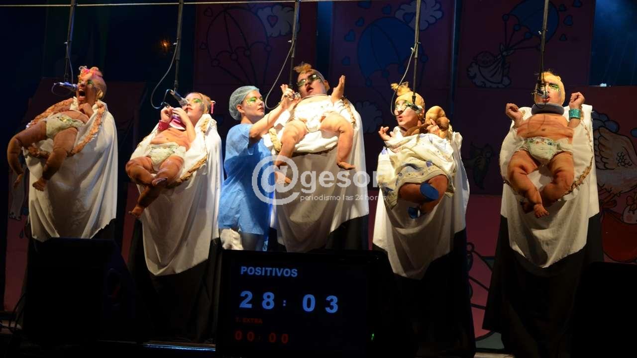 La  noche comenzó  con la actuación de los humoristas  “Positivos”  que se  movieron  con mucha más  soltura  que la vez  anterior  cuando, obligados por el  mal tiempo, tuvieron que  presentarse en el Teatro “28  de Febrero”. La  humorada  sobre los bebés  recién nacidos  fue muy  festejada por  el  público,  culminando con  toda  la fuerza  del grupo en la  canción de  despedida.