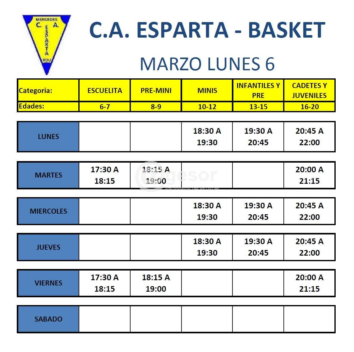 El Club Atlético Esparta de Mercedes continúa trabajando en su gimnasio en la formación de jugadores de sus diferentes categorías formativas, mientras se aguarda el comienzo de la temporada de inferiores de la Liga Regional de Básquetbol de Soriano.