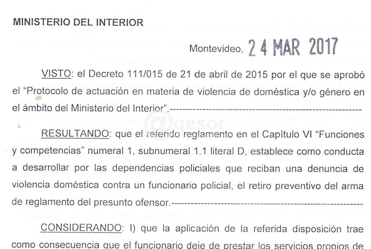 RESULTANDO: que el referido reglamento en el Capitulo VI "Funciones y competencias" numeral 1, subnumeral 1.1 literal D, establece como conducta a desarrollar por las dependencias policiales que reciban una denuncia de violencia doméstica contra un funcionario policial, el retiro preventivo del arma