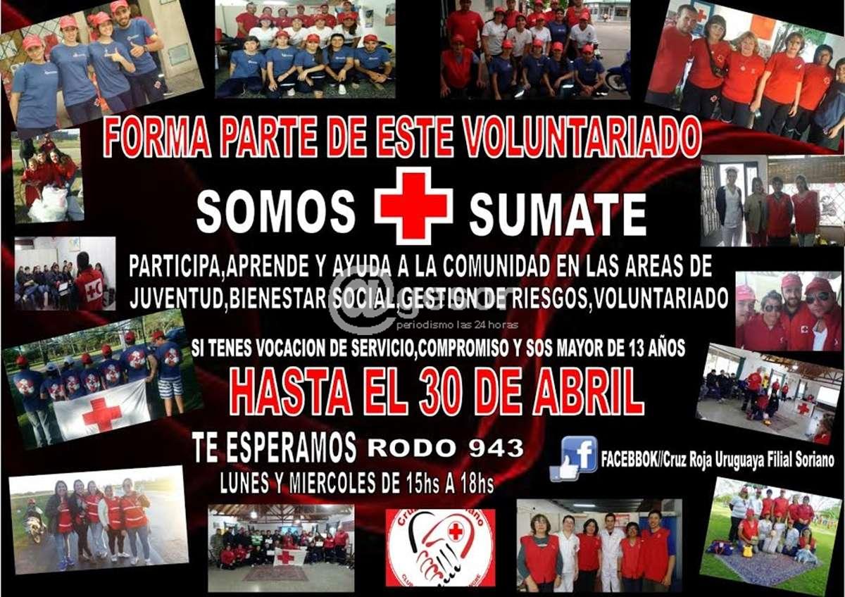 Cruz Roja Departamental de Soriano está realizndo llamado a formar parte del Voluntariado que integra la institución. Convoca a participar, aprender, ayudar a la comunidad en las áreas de juventud, bienestar social, gestión de riesgo, voluntariado. La invitación es para quienes tienen vocación de servicio, compromiso, debiendo ser mayor de 13 años, pudiéndose inscribir hasta el 30 de abril en la sede de Rodó 943 en Mercedes, lunes y miércoles de 15.00 a 18.00 horas.