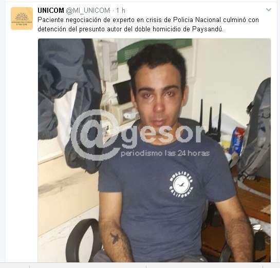 El Ministerio del Interior a través de su Unidad de Comunicaciones informó: "Paciente negociación de experto en crisis de Policía Nacional culminó con detención del presunto autor del doble homicidio de Paysandú".