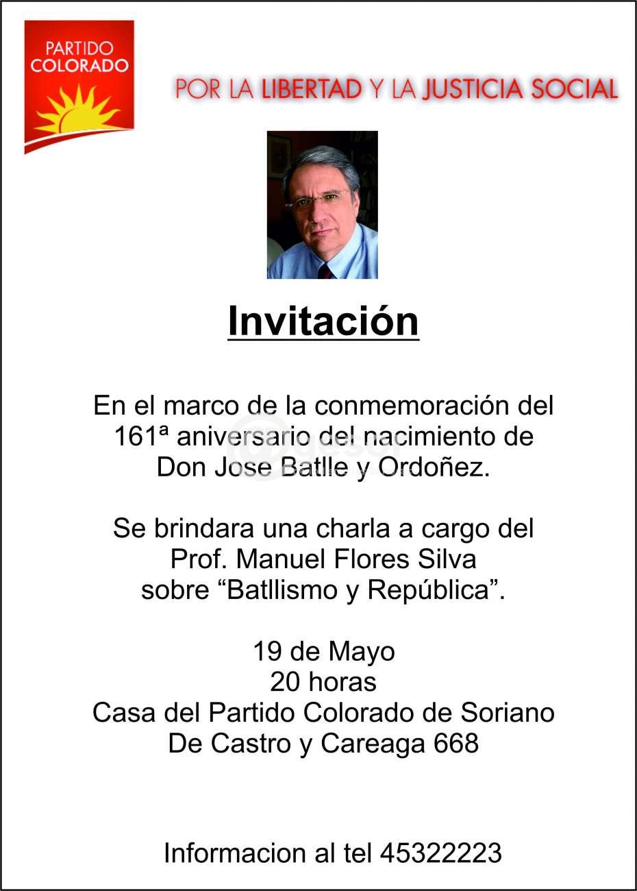 Se brindará una charla a cargo del Prof. Manuel Flores Silva sobre "Batllismo y República".