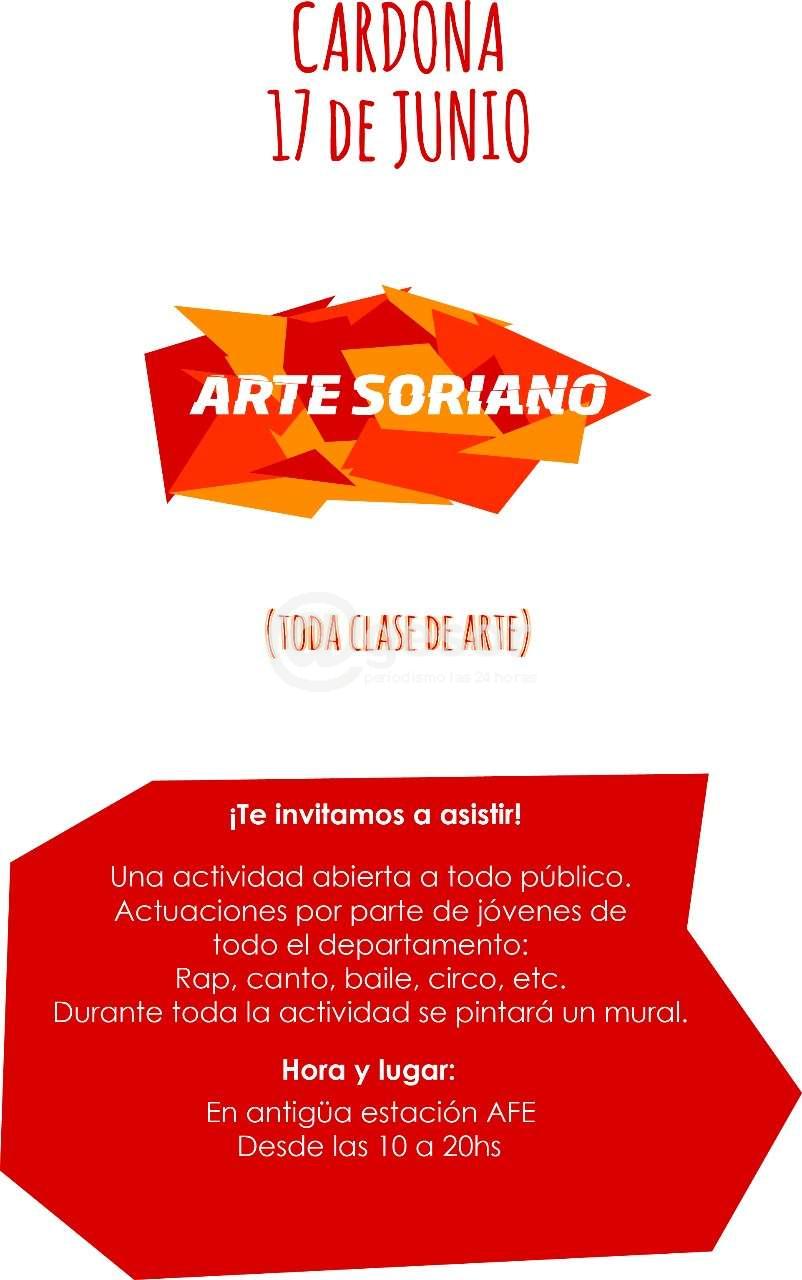 El sábado 17 de junio se estará realizando en el municipio de Cardona el festival denominado “Arte Soriano”,con la participación de jóvenes de todo el departamento de Soriano. Habrá rap, canto, baile y números circenses, entre otras atracciones.