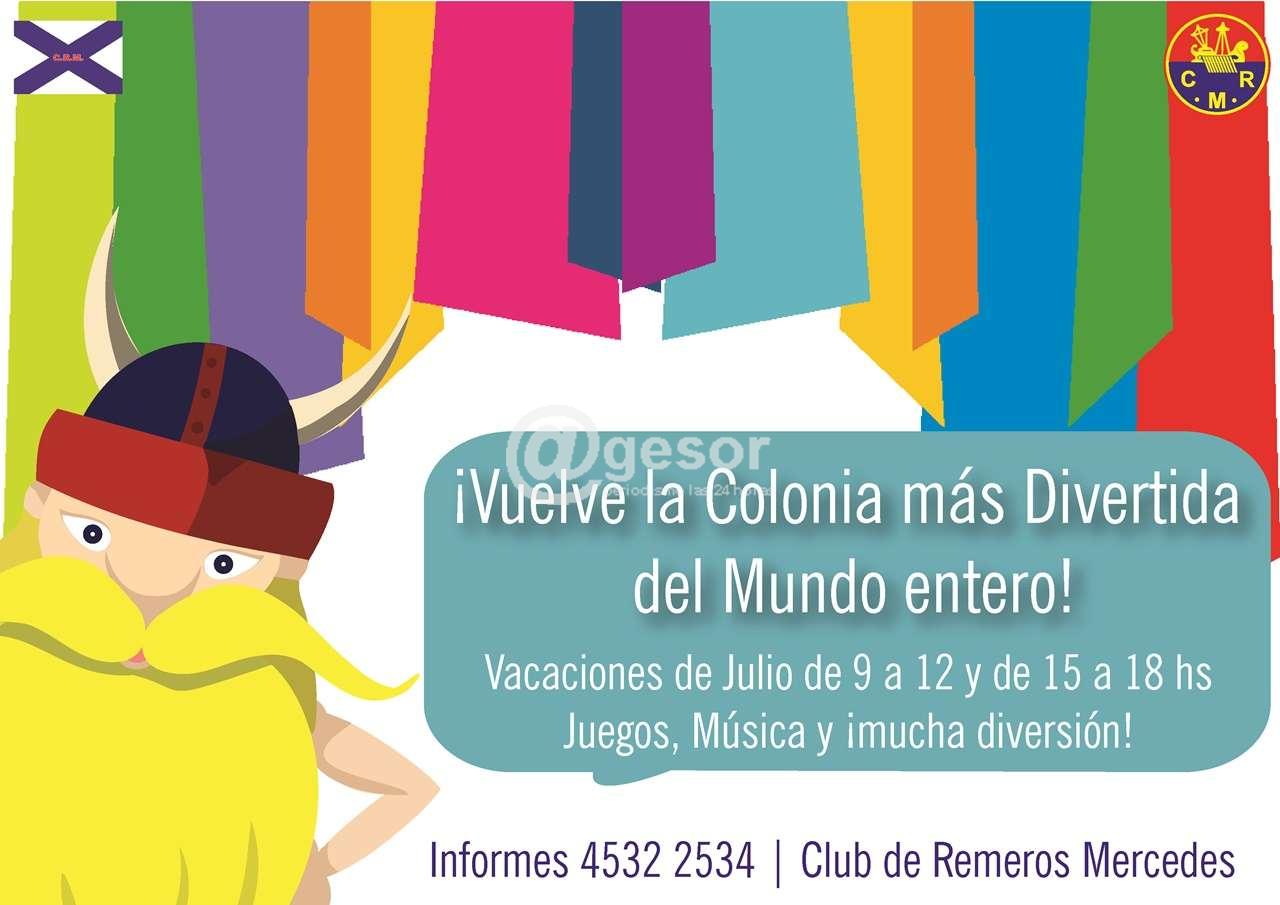 La primera semana de Vacaciones de Julio se estará realizando en Club de Remeros Mercedes la Colonia de Vacaciones a cargo de los profesores Carmen Machín y Leonardo Silva. Dirigida a niños de 6 a 12 años, de lunes a viernes de 9 a 12 y de 15 a 18 hs. Habrá juegos, castillo inflable, cama elástica ¡y mucha diversión!