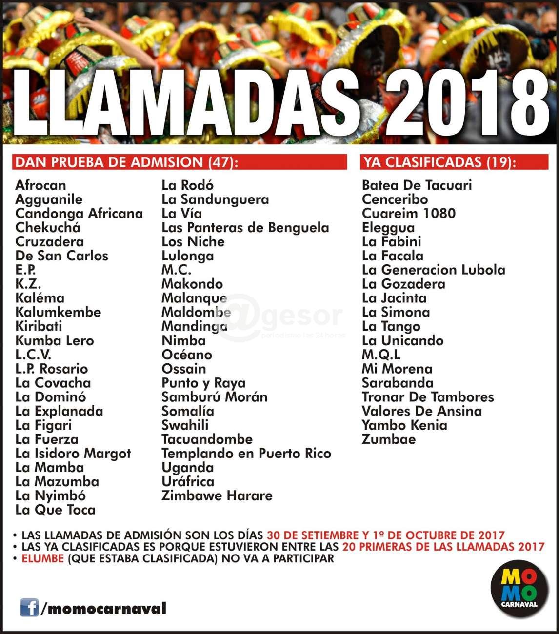 De estas 47 comparsas saldrán las que se sumarán a las 19 ya clasificadas de Las Llamadas 2017, que en realidad eran 20, pero se confirmó que Elumbé que era una de ellas, anunció que no estará participando en 2018.