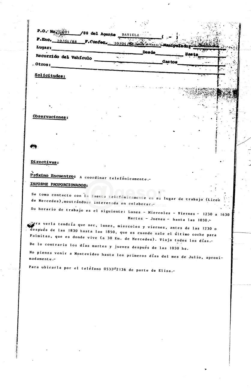 En el rollo 858 correspondiente al año 1988 aparece en escena la agente 02-G, Daniela, y sobre ella el informe establece: “Se toma contacto con la fuente telefónicamente en su lugar de trabajo (Liceo de Mercedes), mostrándose interesada en colaborar”. Se apunta allí el horario de trabajo de la informante y que “para verla tendría que ser, lunes, miércoles y viernes, antes de las 1230 o después de las 1830 hasta las 1850, que es cuando sale el último coche para Palmitas, que es donde vive (a 30 km. de Mercedes). Viaja todos los días. De lo contrario los días martes y jueves después de las 1030 hs. No piensa venir a Montevideo hasta los primeros días del mes de julio, aproximadamente”. Puntualizándose al final de este primer documento que para contactarla había que llamar de parte de Elisa al teléfono 0532 2136; o sea al Liceo N° 2 “Luis A. Zanzi”, que aún hoy mantiene el mismo número.
