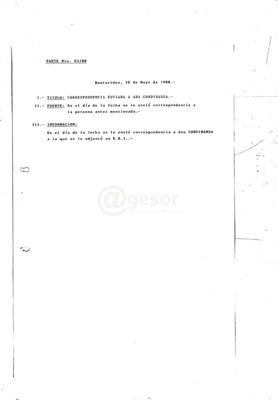Luego de ese contacto inicial el parte N° 02/88 hace referencia a enlace telefónico con Ana Condinanza (a la postre identificada como la agente infiltrada Daniela) y en el parte Nro 03/88 del 20 de mayo de 1988 se da cuenta que “se le envió correspondencia”.