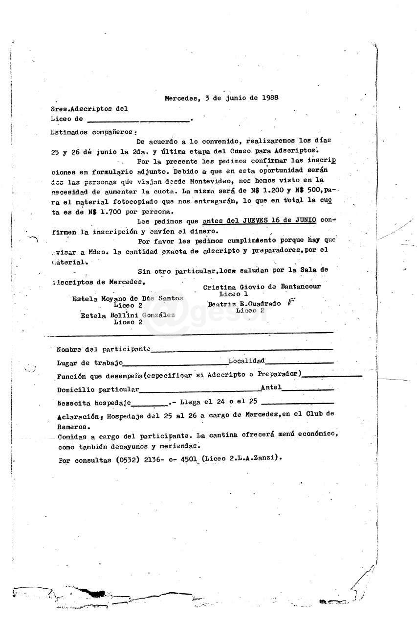 Información: En el día de la fecha, se realiza encuentro con la persona antes mencionada, la que informa que el liceo N° 1 de Mercedes está compuesto plenamente por integrantes del MLN (T) y que en el N° 2, existen unos 4 o 5 que son de derecha los demás todos de izquierda: