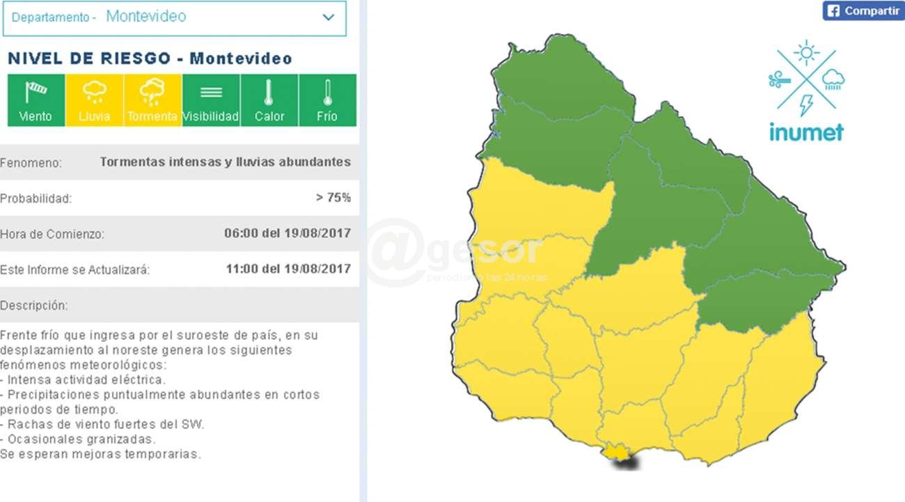 Inumet (Instituto Uruguayo de Meteorología), emitió una alerta amarilla para una amplia zona del país, entre la que se encuentra Soriano, por precipitaciones abundantes y rachas fuertes de viento.