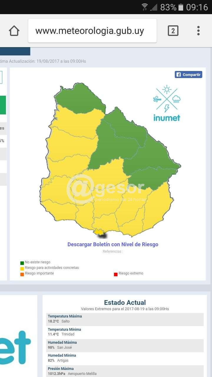 El CECOED actualizó el llamado de atención meteorológico de colora amarillo, el mismo rige desde la hora 9.00 de este sábado y se actualizará a la hora 11:00 del 19/08/2017. El fenómeno se describe como: Frente frío que ingresa por el suroeste de país, en su desplazamiento al noreste genera los siguientes fenómenos meteorológicos: