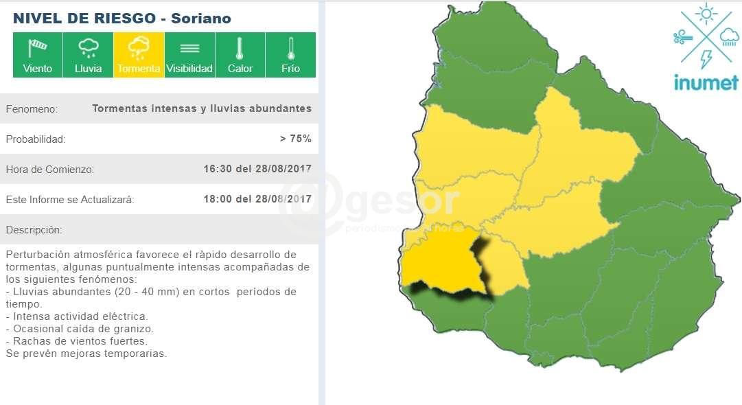 Los departamentos afectados con advertencia de color amarillo son Paysandú, Río Negro, Soriano, Flores, Durazno y Tacuarembó, el resto del país permanece en verde.