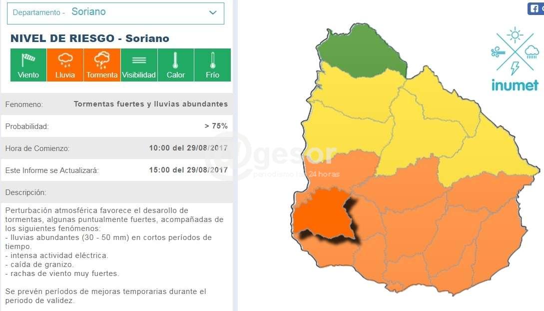 INUMET emitió nuevo alerta de color naranja para trece departamentos, incluyendo Soriano, por perturbación atmosférica que favorece el desarollo de tormentas, algunas puntualmente fuertes, acompañadas de los siguientes fenómenos: