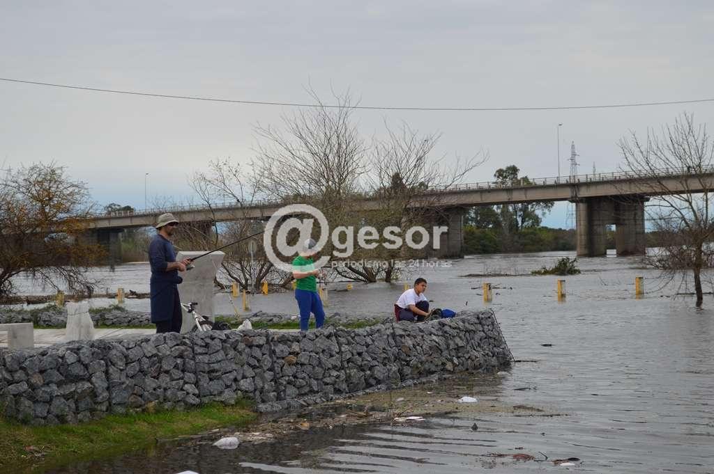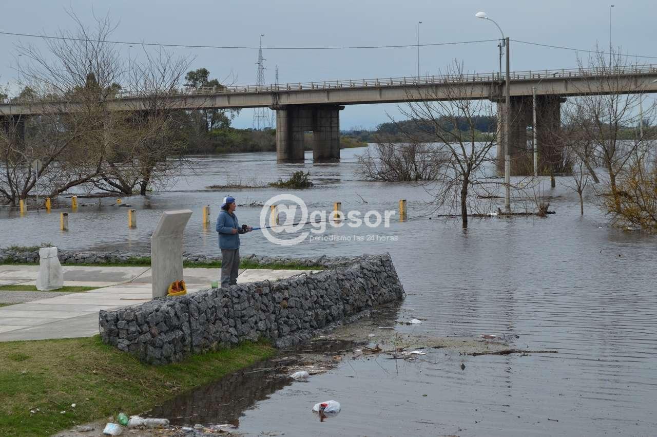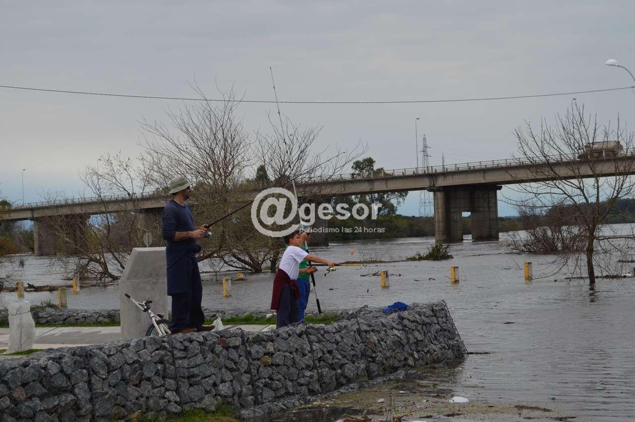 La creciente del río Negro nos viene dejando estas postales del Espacio Memoria donde padres con sus hijos lo utilizan como muelle de pesca. La memoria para los que ya no están y el presente: la vida misma.