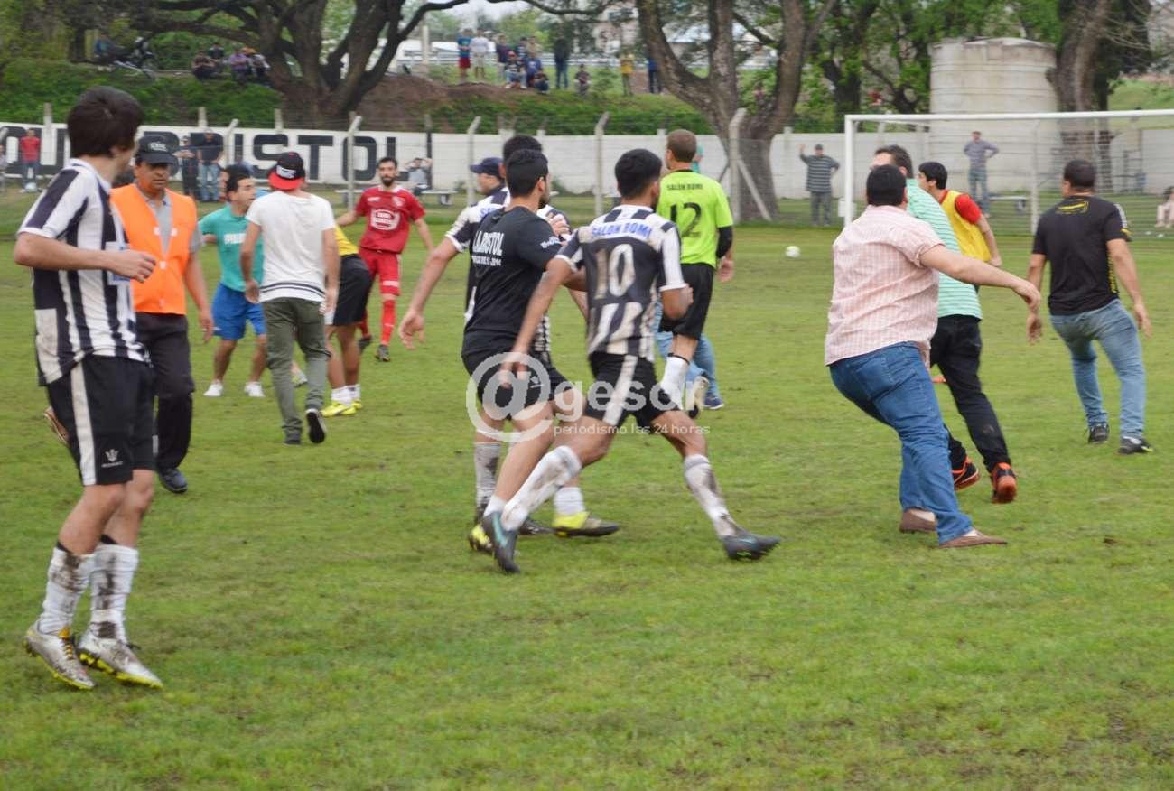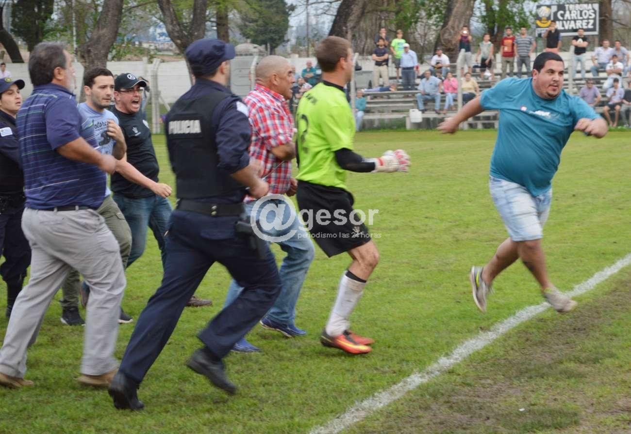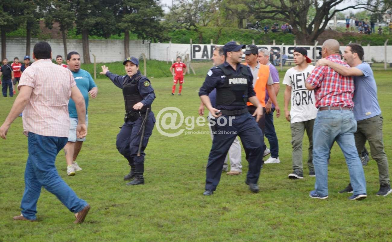Allí ingresan otros particulares de ambos equipos, algunos jugadores más y surgen otros enfrentamientos, dos funcionarios policiales que estaban en el escenario recurren a tratar de calmar los ánimos y a la vez piden refuerzos al GRT. Hay varios enfrentamientos a golpes de puño y patadas entre parciales de ambos equipos y algún jugador, corridas, hasta que llegan hasta el tejido donde se siguen increpando a través del alambrado olímpico.