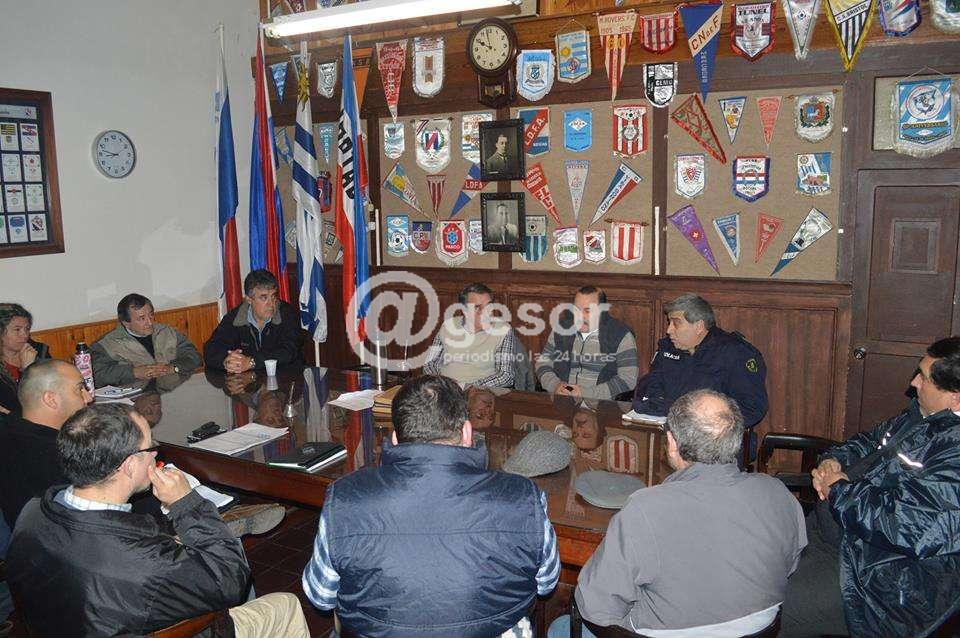 Como adelantáramos oportunamente se reunieron en la sala de sesiones de la Liga Departamental de Fútbol los integrantes del Cuerpo de Neutrales, Presidente y Secretario de la Asamblea de Clubes, el Jefe de Zona I de la Jefatura de Policía de Soriano, Presidente y Secretario de la Agremiación de Arbitros, un integrante del Colegio de Arbitros y representantes de la empresa de vigilancia y seguridad que contrata la Liga para los espectáculos.