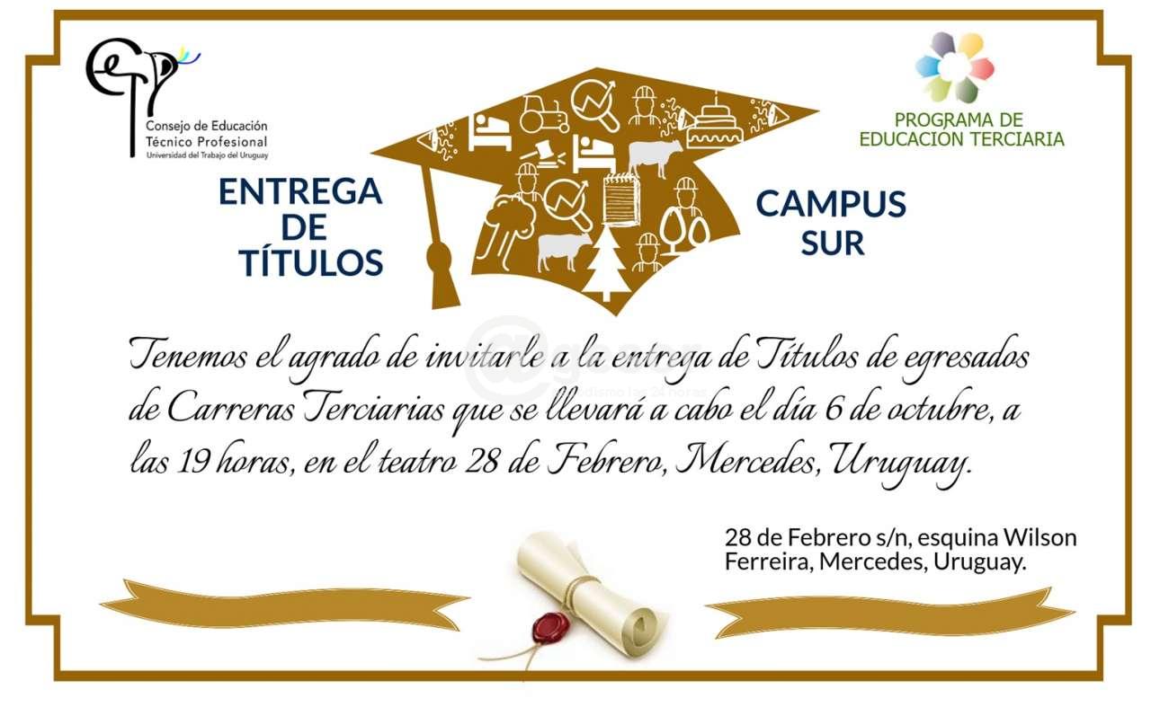 Este viernes en Teatro 28 de Febrero se realizará el acto de entrega de títulos a los egresados de carreras terciarias de UTU. El acto contará con la presencia del El Presidente del Consejo Directivo Central (CODICEN) de la Administración Nacional de Educación Pública (ANEP), Profesor Wilson Netto.