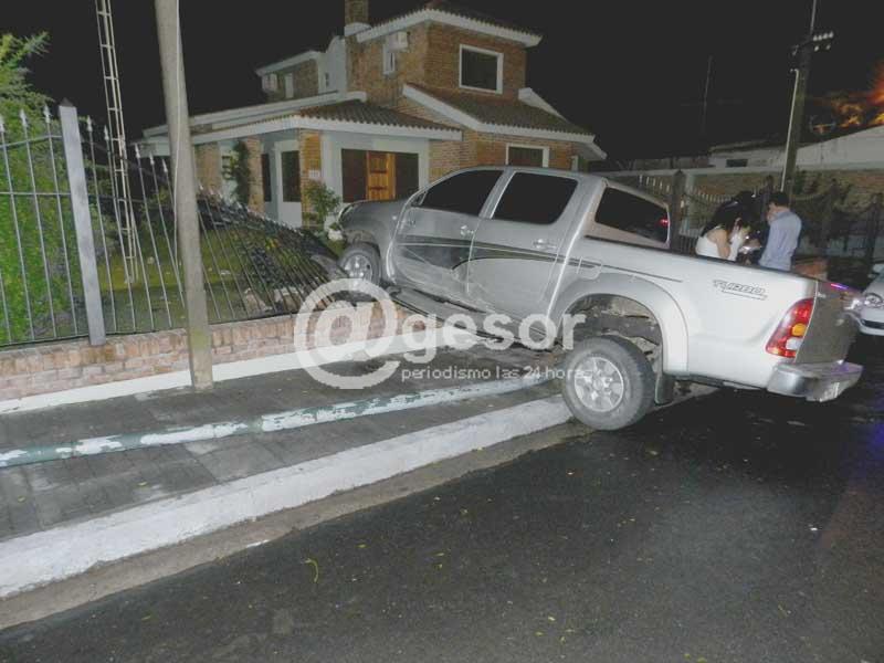 Mientras la Policía y Brigada de Tránsito atendían caída desde una moto de un joven sin lesiones, ocurrida en Oribe y Fregerio, por esta última circulaba la camioneta Toyota Hilux NAH 8892 Turbo, gira por Artigas y en una maniobra que según el conductor se va sobre el cordón de la acera este, la saca hacia el otro lado, y cuando va sobre la acera este vuelve a volantearla y ahí se va definitivamente sobre la finca de la familia Kramarenko sita en el 747 de calle Artigas, frente al estacionamiento de Mercedes Terminal Shopping. Allí se sube a la vereda, derriba una columna de hierro, rompe elmuro y la reja y termina la mitad del vehículo en el parque de la casa. "Parecía que había caído un rayo" dijo el dueño de casa a @gesor. Visiblemente molesto y enojado, Kramarenko señaló "estoy seguro que no venía manejando el muchacho que dicen y al que le hicieron esprimetría y dio bein, sino una muchacha que venía con él, pero nadie quiere decir nada, hay un muchacho que lo vio así y no se animaa decirlo". Esa también fue la versión que manejó la Policía y Tránsito pero sin poder confirmarla. A pesar de la espectacularidad y violencia del impacto no hubo que lamentar lesionados, si importantes daños en la zona de acceso a la finca y en la camioneta cuyo propietario se la había prestado a Luciano Matías Díaz Lima de 18 años a quien la espirometría dio 0º. El conductor no posee licencia de conducir, por lo tanto el seguro no cubre los daños, explicaron los aseguradores que llegaron al lugar. Kramarenko contó a @gesor, "es la segunda vez que me pasa ésto, en abril fue un auto y ahora ésto, no puede ser". Cabe señalar que en determinado momento la discusión entre el dueño de casa y el propietario de la camioneta se tensó y éste último goleó en el rostro a Kramarenko lo que motivó que realizara denuncia policial al personal de seccional 1ª que se acercó al lugar. El hecho ocurrió 4.30 de la madrugada de este sábado.