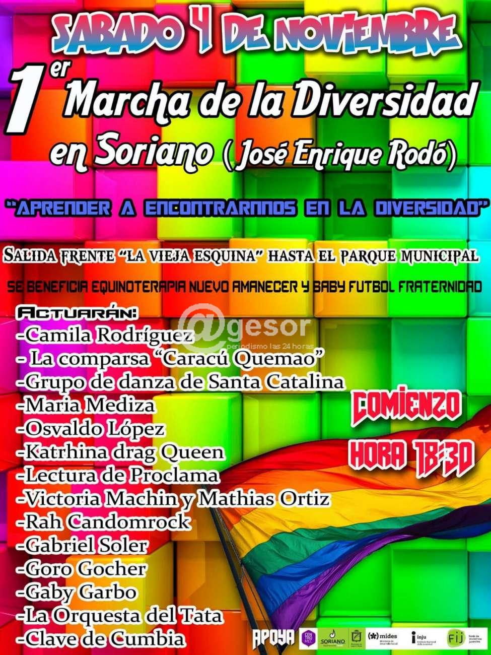 Con el eslogan "Aprender a encontrarnos en la diversidad" está convocándose para la primera marcha de la diversidad en Soriano y que se realizará en el municipio de José Enrique Rodó el sábado 4 de noviembre.
