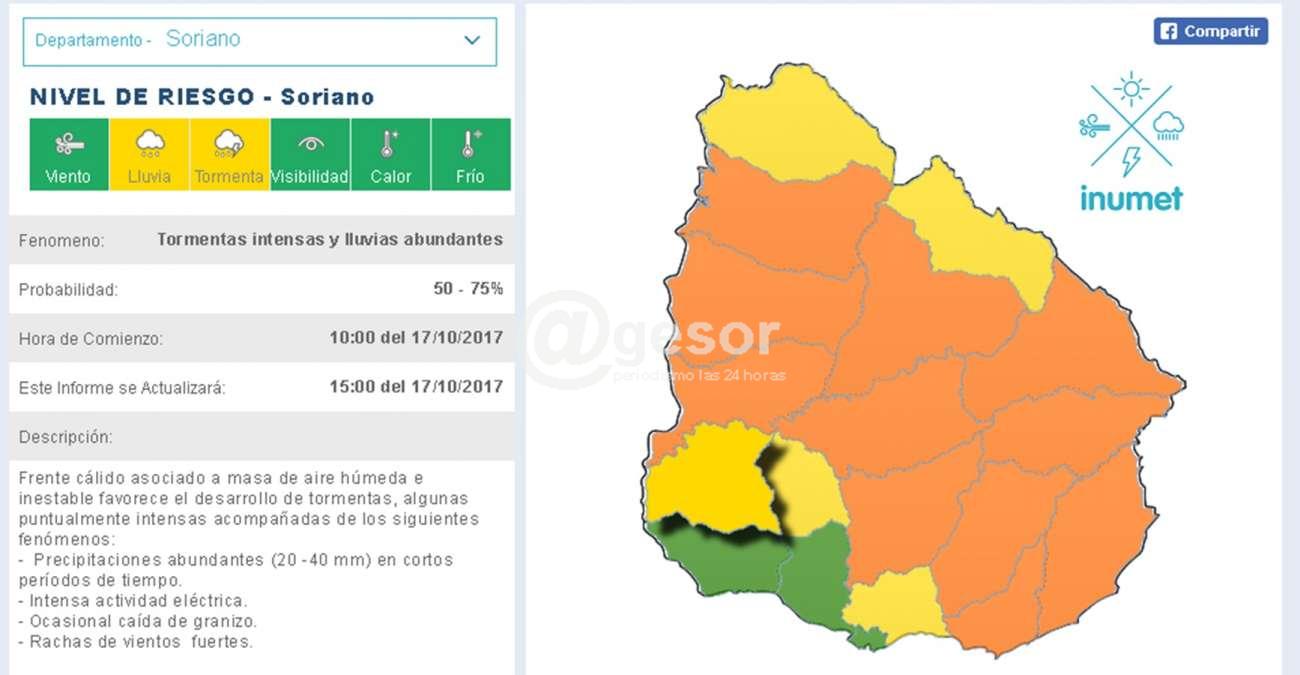 En los departamentos de: Artigas , Rivera , Soriano , Flores y Canelones se encuentra vigente un nivel de riesgo amarillo por los mismos fenómenos pero en menor intensidad.