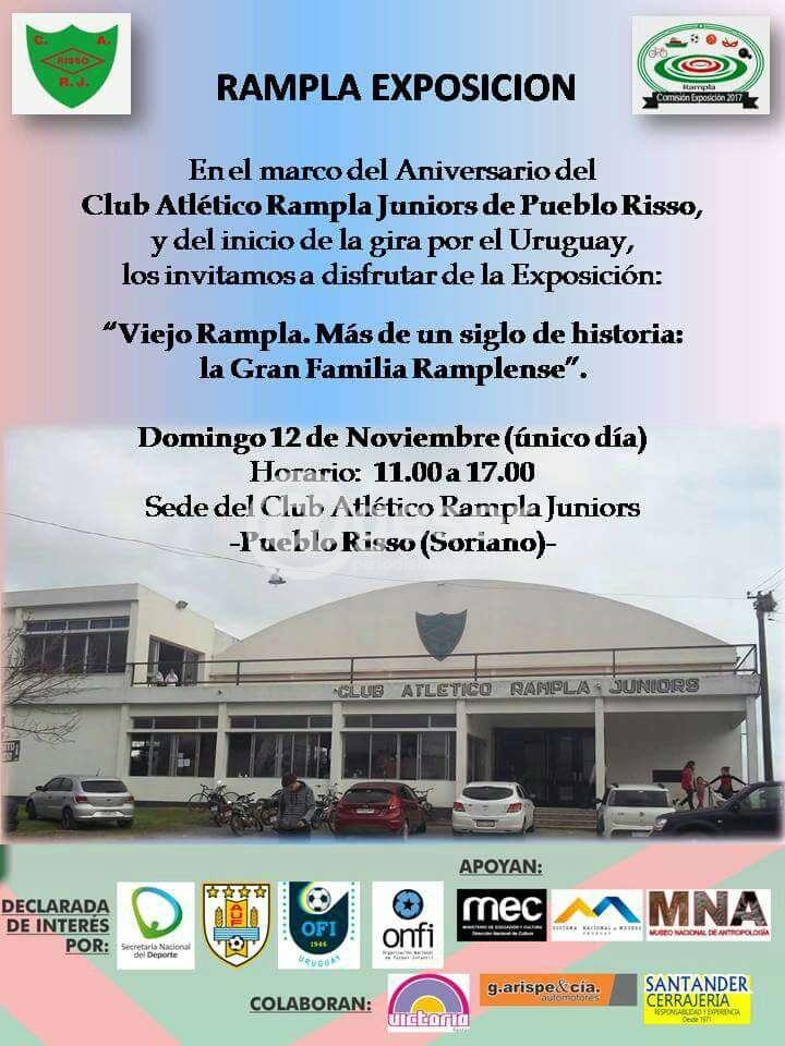 En el marco del aniversario del Club Atlético Rampla Juniors de pueblo Risso, y del inicio de la gira por el Uruguay, está invitándose a disfrutar de la exposición titulada: "Viejo Rampla. Más de un siglo de historia: la Gran Familia Ramplense". Será este domingo 12 (único día) de 11.00 a 17.00 horas en la sede del Club Atlético Rampla en pueblo Risso (Soriano).