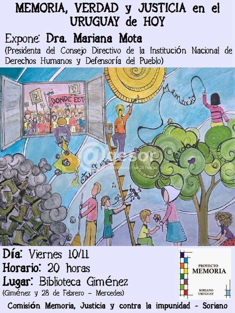 Con la organización de la Comisión Memoria, Justicia y contra la Impunidad de Soriano, este viernes 10 estará realizándose charla a cargo de la Dra. Mariana Mota, Presidenta del Consejo Directivo de la Institución Nacional de Derechos Humanos y Defensoría del Pueblo, titulada "Memoria, Verdad y Justicia en el Uruguay de Hoy".