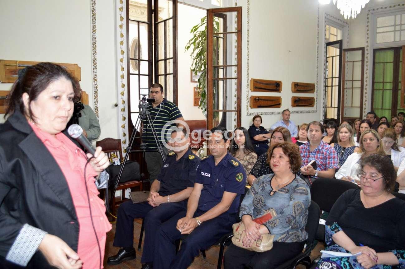 En salón de actos de la Jefatura de Policía de Soriano se realizó la presentación del programa "Tobilleras", a cargo de July Zabaleta, Directora de la División Políticas de Género del Ministerio del Interior, con la presencia de las principales autoridades policiales del departamento, también jueces, fiscales, ediles, directores de la comuna, alcalde doloreño, defensores de oficio, personal de la salud, entre otras autoridades y funcionarios.