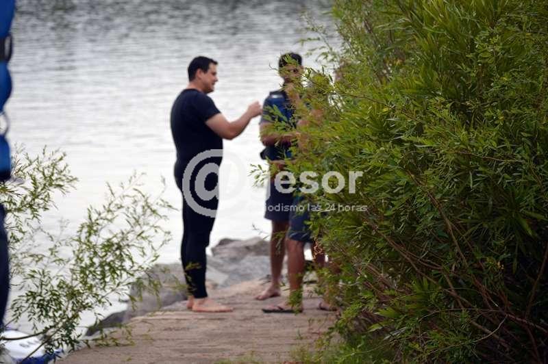 Próximo a las 16.30 horas de este jueves integrantes del equipo de buzos de La Armada que arribaron al mediodía para trabajar en la búsqueda del cuerpo del joven que desapareciera en aguas del río Negro en la zona de isla del Puerto este miércoles mientras se bañaba en lugar no habilitado para baños recreativos, junto a otras personas y perdió pie.