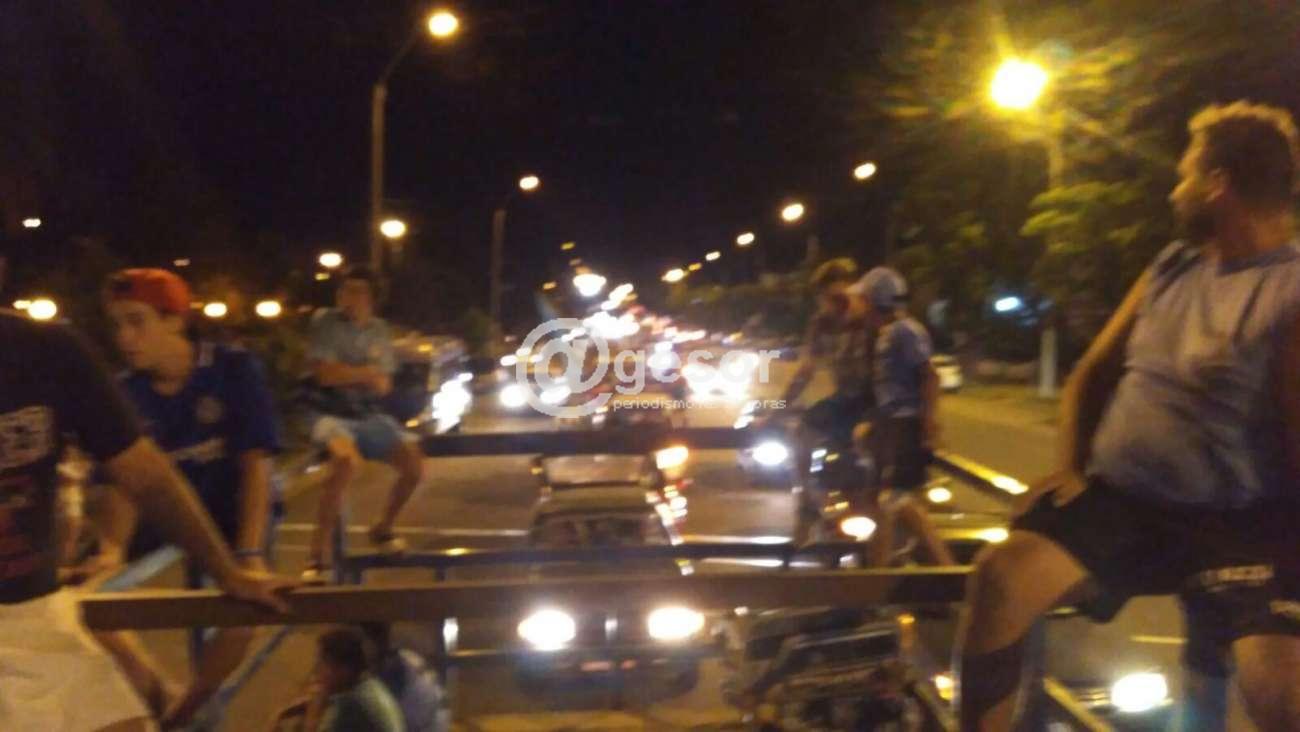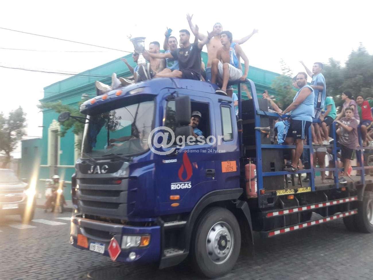 La caravana que comprendía algunas cuadras, estaba formada por autos, camionetas, motos. De las ventanas salían banderas celestes los rodados, de todo tipo y color, iban con hinchas eufóricos, que dieron rienda suelta a un título esquivo durante muchos años que hizo se olvidar algún mal rendimiento del equipo, que más de una vez los había hecho irse masticando bronca de la cancha, para apoyar a los suyos.