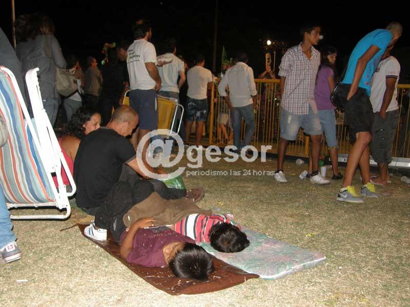 Un hecho significativo en la semana que pasó fue la masiva concurrencia de público que noche a noche llenó el amplio predio de la Manzana 20, donde las familias disfrutaron de los espectáculos en un ambiente de distendida camaradería.  Personas mayores con sus  sillas plegables, junto a jóvenes que sentados en el pasto aplaudían a sus conjuntos predilectos. Niños corriendo o jugando en  absoluta libertad. O como lo registra esta fotografía, una pareja  escuchando atenta el desarrollo de la actuación de la Murga doloreña 7 y 3, mientras sus hijos,  en un par de colchonetas, duermen apaciblemente,  ajenos a todo.
