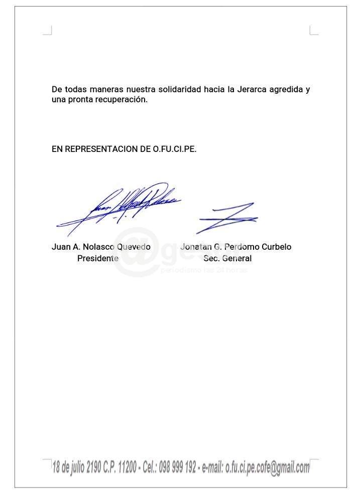 En representación de OFUCIPE, firman Juan A. Nolasco Quevedo (Presidente) y Jonatan G. Perdomo Curbelo (Secretario General).