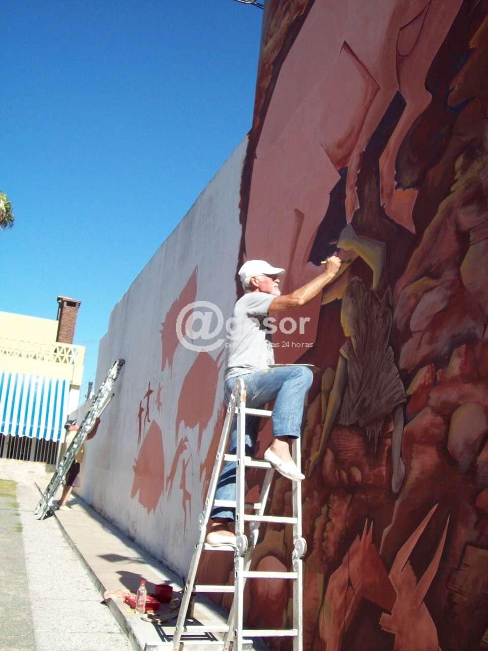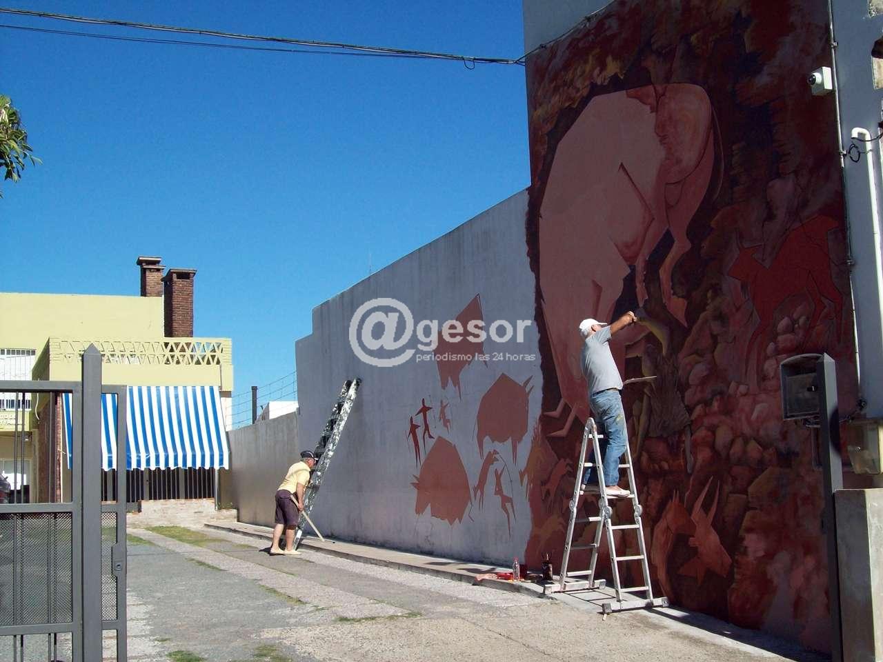 Los artistas locales Angel Juárez y Enrique Rey desde hace algunos días vienen trabajando en esta obra que pretende ser un homenaje a las pinturas rupestres de Altamira. Se trata de una obra de la autoría de Juárez con la activa colaboración de Rey. La obra ocupará toda la pared lateral de la zona de estacionamiento de la Intendencia de Soriano, y que ya comenzó a tomar color a impulso del trabajo de estos dos artistas, quienes por las dimensiones de la superficie estiman les llevará varios días de trabajo poder completarla.
