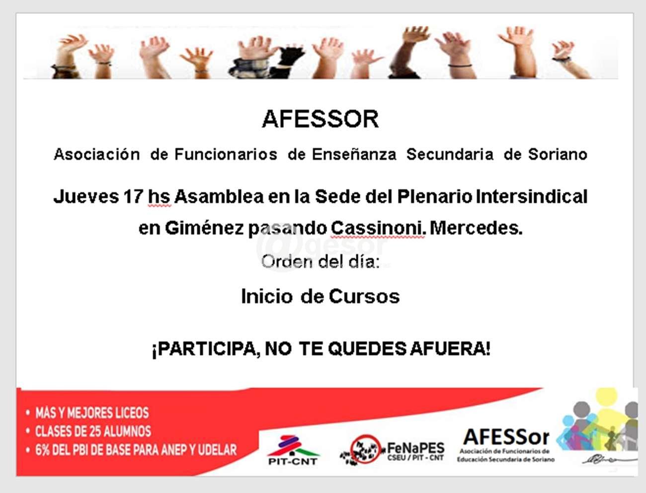 Jueves 17 hs Asamblea en la Sede del Plenario Intersindical en Giménez pasando Cassinoni. Mercedes.