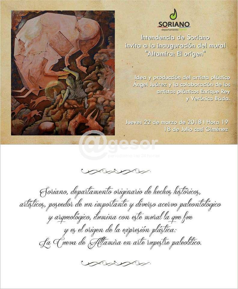 “Soriano, departamento originario de hechos históricos, artísticos, poseedor de un importante y diverso acervo paleontológico y arqueológico, ilumina con este mural al que fue y es el origen de la expresión plástica: la cueva de Altamira en arte rupestre paleolítico”, expresa la tarjeta de invitación a la inauguración.
