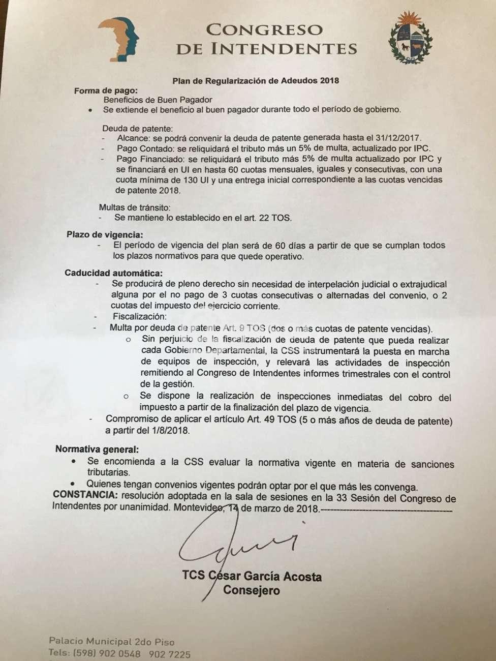 El Congreso de Intendentes acaba de aprobar el texto del Plan de Regularización de Adeudos en Patente de Rodados y del cual ofrecemos lo oficialmente acordado por los jefes comunales y que deberá instrumentarse en breve por parte de las intendencias, sabiendo que de acuerdo a lo que se indicó, por parte de la comuna sorianense, al menos, este plan debe pasar por la Junta Departamental de Soriano para su anuencia.