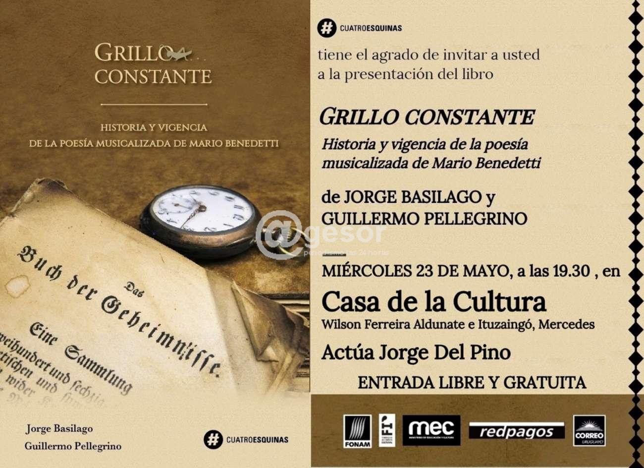 Este miércoles 23 estará presentándose en Mercedes, el libro "Grillo constante - Historia y vigencia de la poesía musicalizada de Mario Benedetti", de autoría de Jorge Basilago y Guillermo Pellegrino.