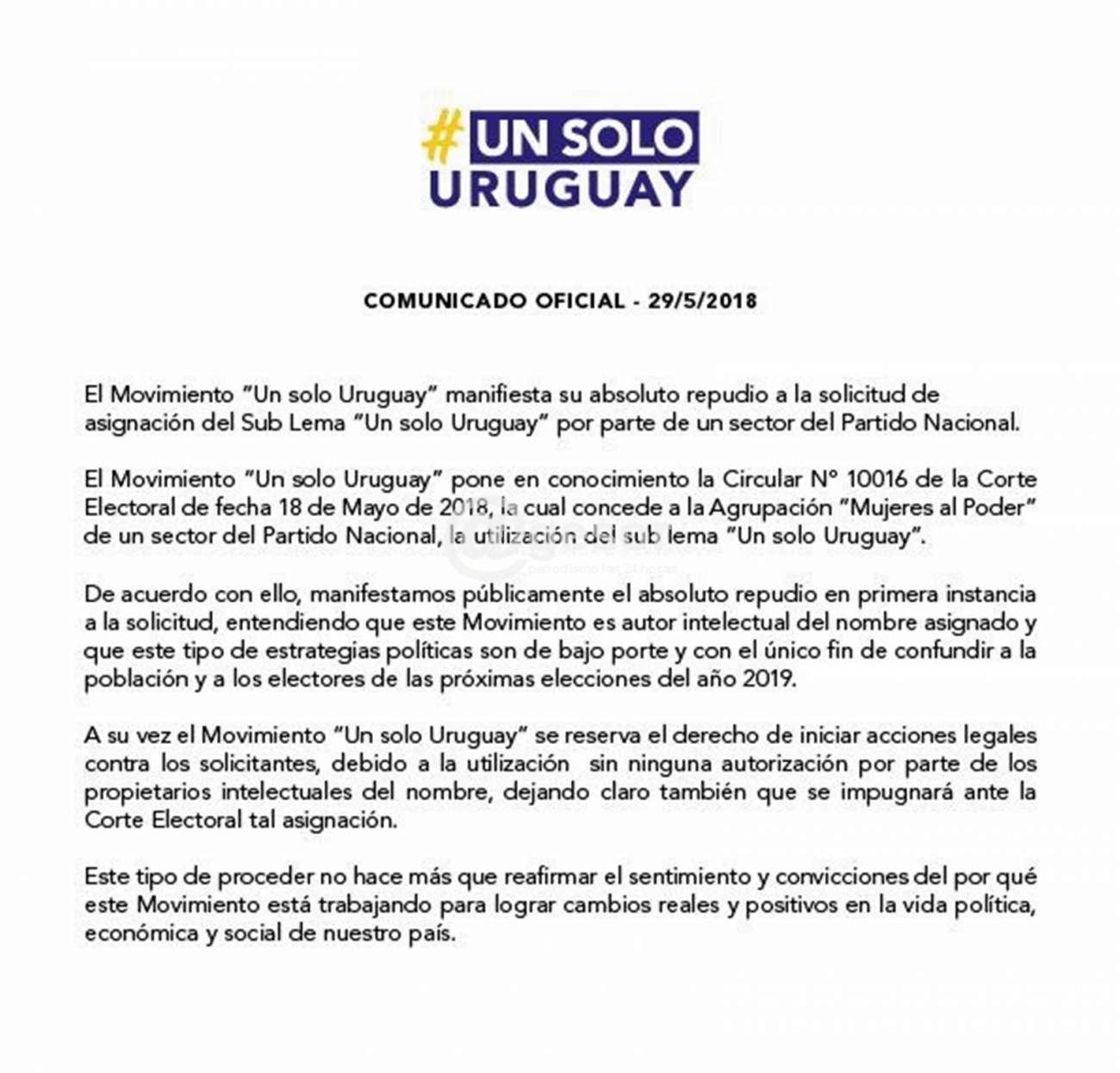 El movimiento "Un Solo Uruguay" pone en conocimiento la Circular N° 10016 de la Corte Electoral de fecha 18 de mayo de 2018, la cual concede a la Agrupación "Mujeres al Poder" de un sector del Partido Nacional, la utilización del sub lema "Un Solo Uruguay".