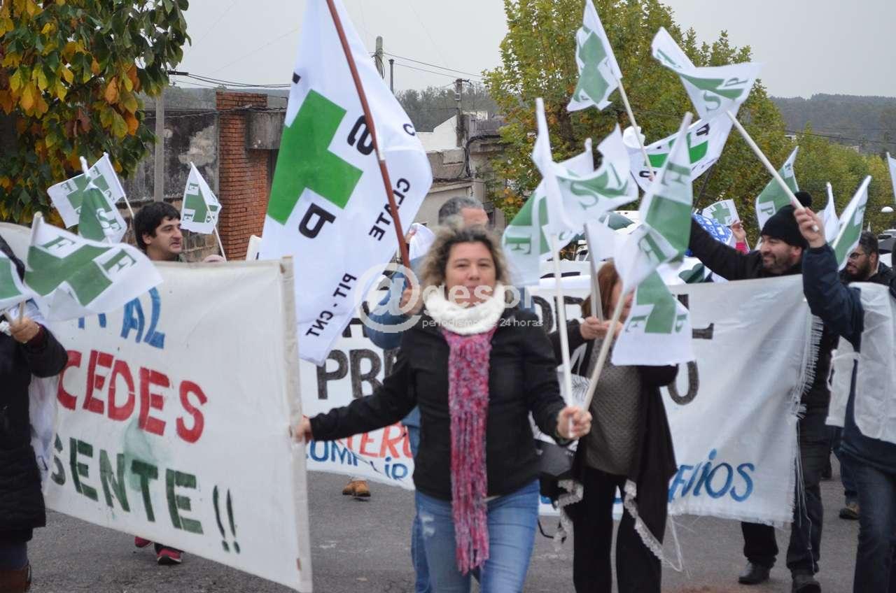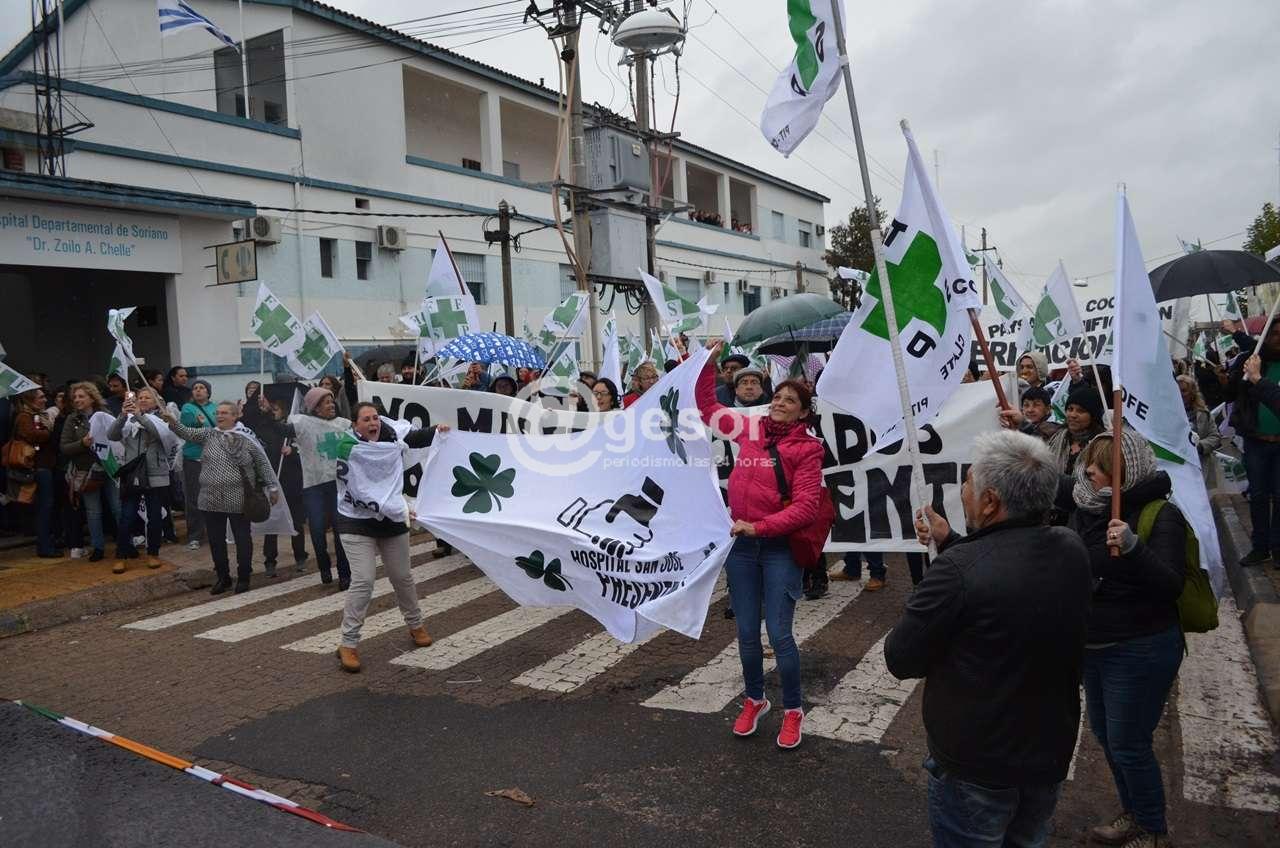 Funcionarios de Salud Pública de varios puntos del país llegaron a Mercedes para participar de la movilización convocada por la Federación de Salud Pública. Como estaba previsto se congregaron en Plaza Independencia para marchar hasta el Hospital Mercedes “Zoilo A. Chellle” donde realizaron u n acto, bajo la lluvia que a esa hora caía con fuerza en Mercedes.