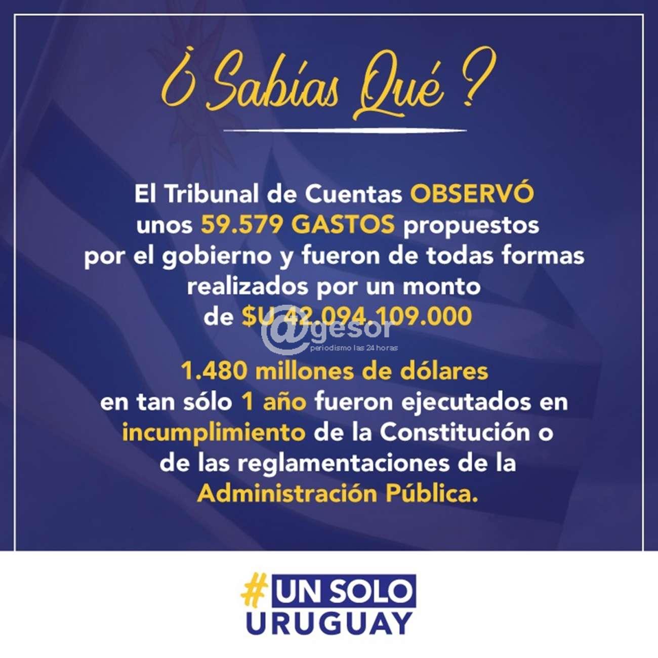 El movimiento publicará a través de sus redes y de forma diaria, una serie de mensajes en los que se detallarán diferentes hechos que si bien son de acceso público, la población no tiene conocimiento sobre ellos. Por ejemplo, el primer gráfico indica que el Tribunal de Cuentas observó unos 59.579 gastos, y que los mismos fueron realizados de todas formas por un monto total de 42.094.109.000 pesos. Esto quiere decir que unos 1.480 millones de dólares en tan sólo 1 año, fueron ejecutados en incumplimiento de normas constitucionales o de la administración pública.