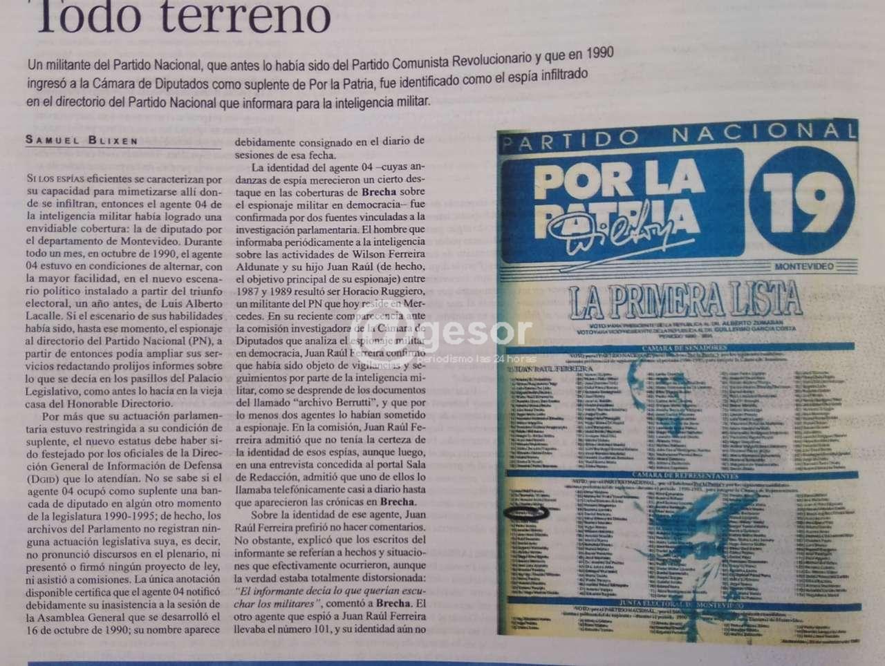 “El hombre que informaba periódicamente a la inteligencia sobre las actividades de Wilson Ferreira Aldunate y a su hijo Juan Raúl ( de hecho, el objeto principal de su espionaje) entre 1987 y 1989 resultó ser Horacio Ruggiero, un militante del PN que hoy reside en Mercedes” expresa el informe del semanario Brecha.