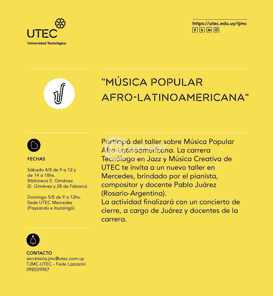 “Música Popular Afro-latinoamericana” será el título de un par de charlas-taller que se dictarán en Mercedes el sábado y domingo próximo. La actividad en promovida por la UTEC, estando a cargo del compositor y docente Pablo Juárez.